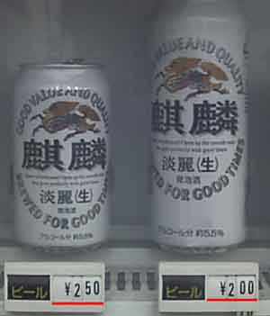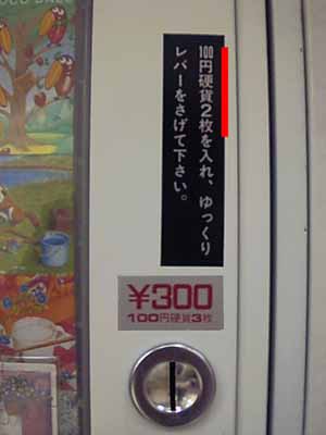 500ccが200円で、350ccが250円??大きいほうが人気なのは言うまでもありません。どうも小さいほうの値段表示が間違っているようです。200円投入で、赤ランプがついたらしいです(茨城県、東海村で)。
