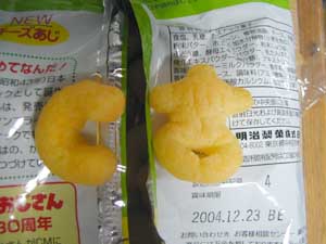 040717 おかしな形のカール チーズ味を発見しました。左は正常な形です。